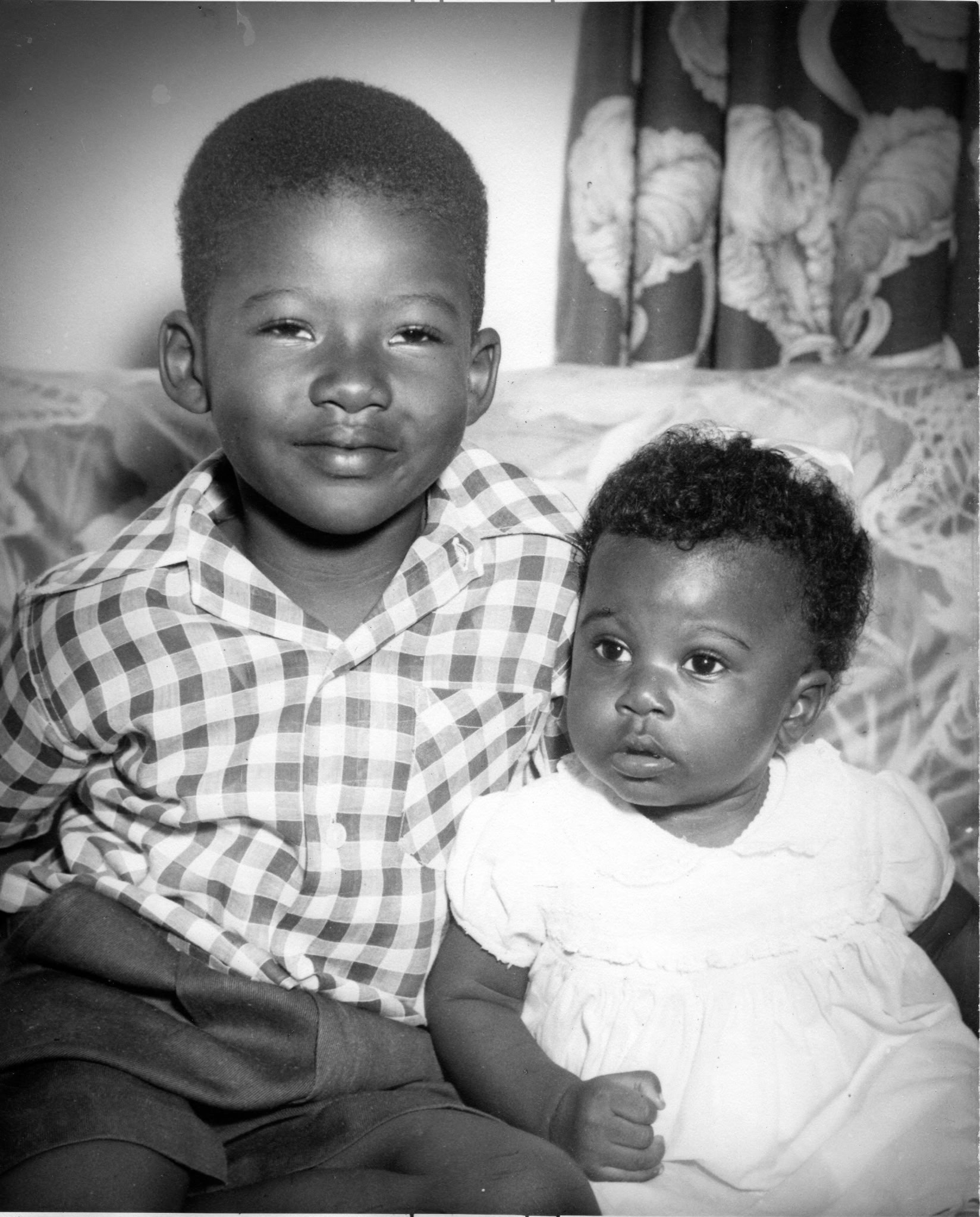 A black and white photograph of siblings Sumner Hutcheson III and Pamela Hutcheson.